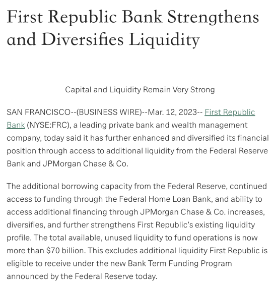 赶在周日深夜,第一共和银行在官网发布声明称,该行已经从美联储和摩根大通处获得额外的流动性支持,并进一步加强流动性。在不计算美联储BTFP工具的情况下,目前整体可用于经营活动的流动资金超过700亿美元。