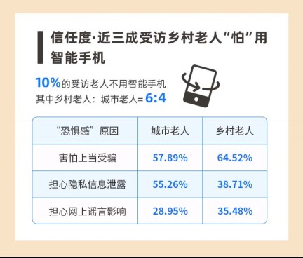 报告显示,近三成受访乡村老人“怕”使用智能手机,不敢使用的三大理由分别是“怕麻烦别人”“怕被骗”“怕不安全”。近四成受访乡村老人表示,只会使用三个手机功能,会使用十个以上手机功能的乡村老年人仅有22.77%;超四成受访乡村老人还不会用手机支付,66%的乡村老人更愿意使用现金支付。