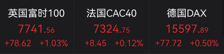 欧洲主要股指集体收涨,德国DAX指数涨0.50%,英国富时100指数涨1.03%,法国CAC40指数涨0.12%。