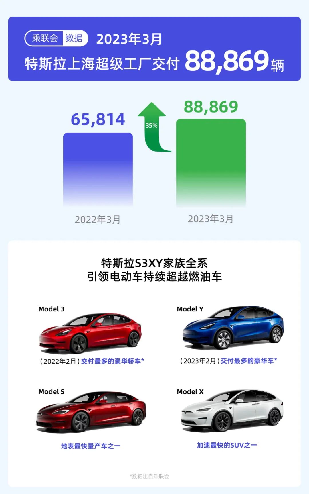 乘联会最新发布的预估销量数据显示,3月特斯拉交付量持续增长:上海超级工厂共计交付88869辆,同比增长35%。