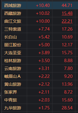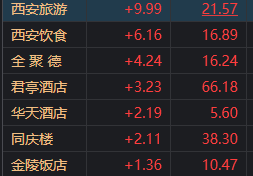 今日景点及旅游、酒店及餐饮板块尾盘活跃,全天均涨超3%,西域旅游涨超10%,西藏旅游、曲江文旅、西安旅游涨停,长白山、三特索道、西安饮食、全聚德等跟涨。