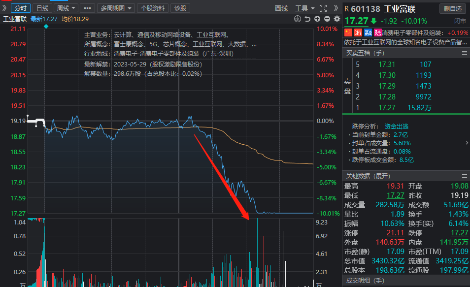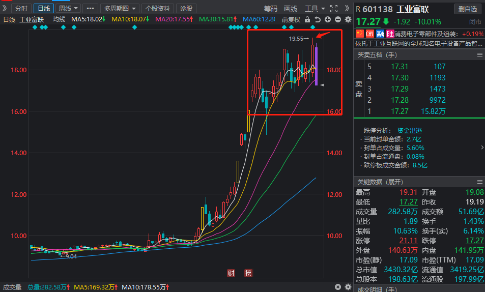 今日,全球知名电子设备产品智能制造服务商工业富联午后跳水至跌停,报17.27元/股,成交额超50亿元,总市值3430.32亿元。