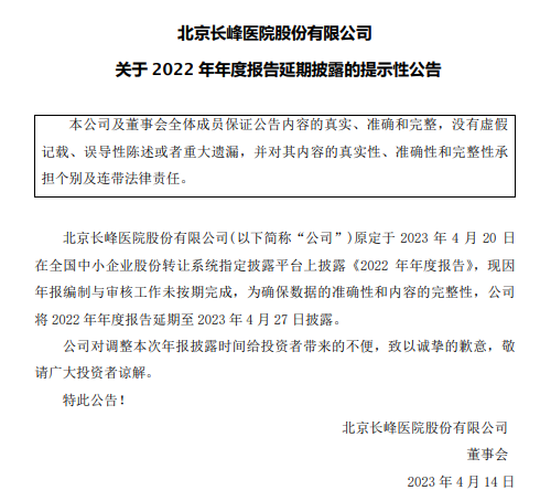 值得注意的是,4月14日,北京长峰医院股份有限公司发布关于2022年年度报告延期披露的提示性公告,因年报编制与审核工作未按期完成,公司将2022年年度报告延期至2023年4月27日披露。