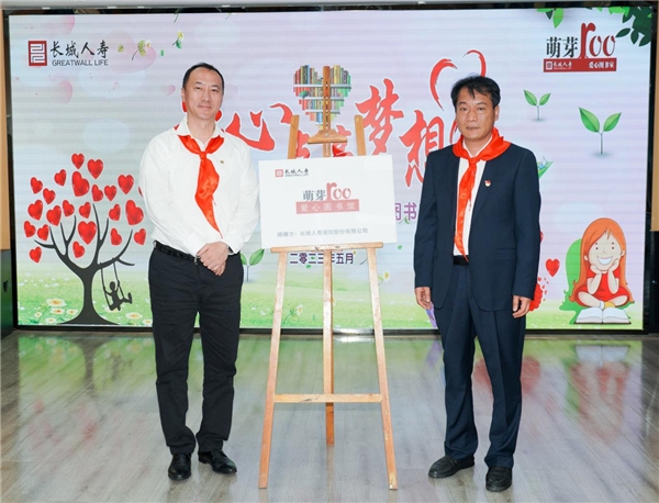 长城人寿党委书记、董事长白力与祖庵中心学校校长冯军奇、副校长宋广柱一同为“萌芽100”爱心图书室揭牌,进行图书捐赠,并接受校方回赠的“书送希望聚万卷 践行公益扬爱心”锦旗以及学生书画作品。