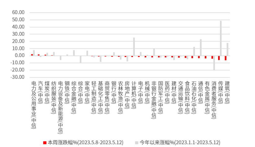 行业方面,电力及公用事业、汽车、煤炭本周领涨;建筑、传媒领跌,跌幅均超过5%。5月8日,银行股大象起舞备受关注,但好景仅持续了一天,9日开始市场风格大变,新能源车产业链在10日、11日短暂反弹后继续回落。