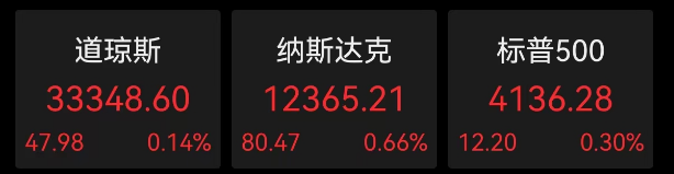 美股三大指数集体收涨,纳指涨0.66%,标普500指数涨0.30%,道指涨0.14%。
