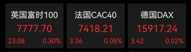 欧洲主要股指收盘普涨,德国DAX指数涨0.02%,英国富时100指数涨0.30%,法国CAC40指数涨0.05%。