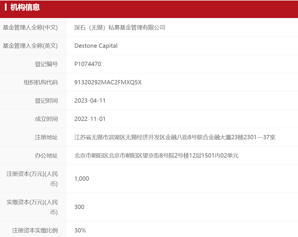 基金业协会官网显示,深石(无锡)私募基金管理有限公司成立于2022年11月1日,2023年4月11日,在基金业协会完成登记,业务类型同样是私募股权投资基金、私募股权投资类FOF基金 、创业投资基金 、创业投资类FOF基金 ,目前无在管理私募基金。王石则是这家私募基金的实际控制人。