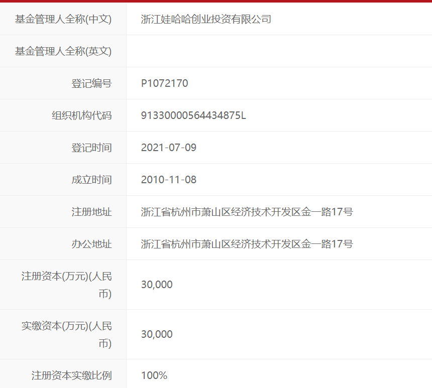 中国证券投资基金业协会官网显示,2010年11月8日,娃哈哈创投正式成立,直到2021年7月9日正式在基金业协会完成登记,业务类型包括私募股权投资基金、私募股权投资类FOF基金、创业投资基金、创业投资类FOF基金,管理规模在0-5亿元。从最新情况来看,成立了丽水娃哈哈私募基金合伙企业(有限合伙)。