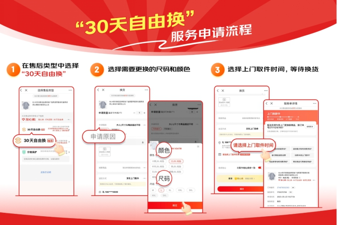 5月26日,京东正式上线鞋服“30天自由换”服务,鞋服品类在原有价保、上门换新、闪电退款等多项服务的基础上,由7天无理由换升级为30天无理由换、15天质量换升级为30天质量换,为消费者带来鞋服0成本多轮自由换的保障,全面解决用户因颜色、尺码等问题带来的消费顾虑。