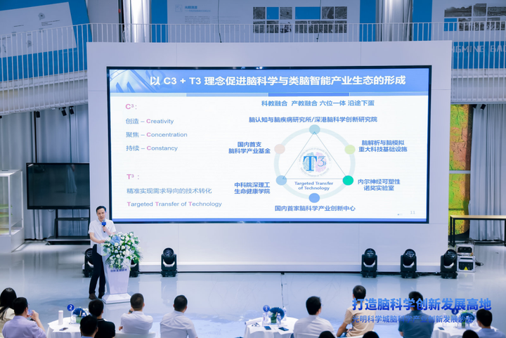 活动上,深港脑科学创新研究院院长王立平对国内脑科学产业发展以及光明区脑科学优势基础进行了分享,他表示:“通过创新、创投、创业三创合一的融合发展,光明区解决了脑科学和脑技术领域研发过程中的‘卡脖子’技术,在深圳市打磨出一套适用于脑科学与类脑智能产业的创新生态模式。”