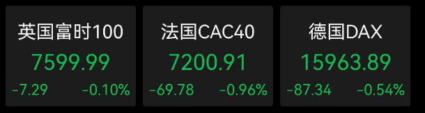 欧股主要指数普遍收跌,德国DAX30指数跌0.54%,英国富时100指数跌0.10%,法国CAC40指数跌0.96%。