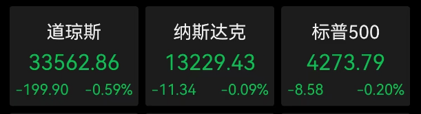 美股三大指数集体收跌,道指跌0.59%,纳指跌0.09%,标普500指数跌0.20%。