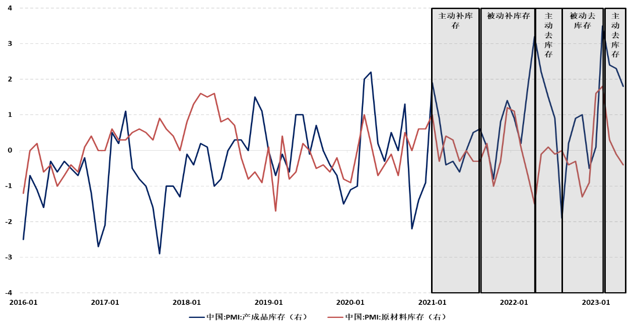 中国经济从被动去库阶段短期逆向进入主动去库阶段。正常的一轮库存周期中,被动去库阶段后对应的是主动补库阶段。当经济运行至复苏期,市场的需求快速上升,但是企业的产能提升需要一段时间,产成品库存在这个阶段会被动下降,先知先觉的企业会增加原材料库存。等到企业产能恢复后,原材料库存和产成品库存会出现同时上升的现象,因此,被动去库阶段后紧接主动补库是常见的现象。但是,本轮库存周期内,市场的需求在一季度短暂井喷后,又突然快速地下降,反映疫情政策放松后,积压的需求一次性释放,市场真实的需求却不足。因此,原材料库存和产成品库存双双下降,其中原材料库存下降速度更快,且已经运行于历史均值下方,背后反映企业信心快速下降,不愿意提前增加原材料库存,短期内没有扩张的意愿。