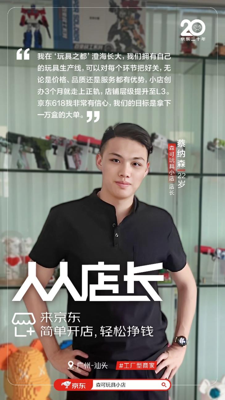 毕业后,蔡纳森的第一份工作就是在别人公司做京东店铺的运营,练习了两年半,自主创办“京东森可玩具小店”。京东对小店商家的帮扶给了蔡纳森十足的信心,小店创办3个月就走上正轨,并且跟随京东“店铺星级”各项服务指标的指引,帮助小店把用户体验越做越好,获得了搜索推荐、频道场域等更多曝光机会,店铺层级也提升至L3,蔡纳森下半年的目标是带领小店向L1级店铺进发。