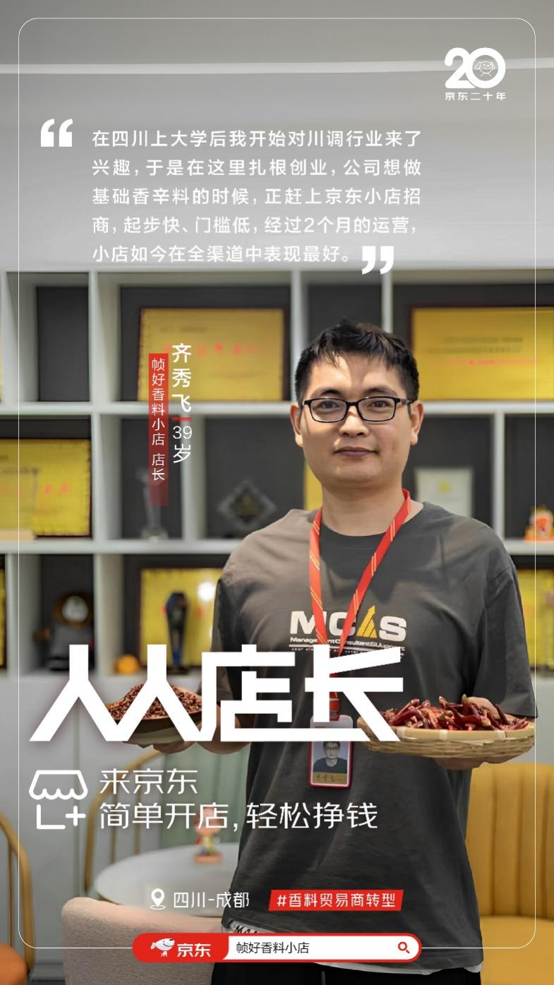 四川的调料加工厂密集,具有天然的供应链优势。2023年2月,为了在细分市场中做精做强,齐秀飞决定聚焦在基础香辛料版块持续深耕,期间正好碰到京东推出“春晓计划”,对个人开店有较大的政策支持,齐秀飞随即在京东快速注册了香料小店。入驻京东后,店铺享受技术服务费率低至0%的优惠政策,免费流量占比达2/3,帮齐秀飞的店铺快速起步,刚开店第一个月就实现进店访客近万人,转化率也远超其他新商家。经过2个月的运营,齐秀飞运营的京东小店在全渠道中表现最好。