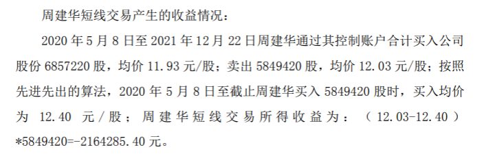 而对于收益情况,按照先进先出的算法,2020年5月8日至截止周建华买入584.94股时,买入均价为12.40元/股,周建华短线交易所得收益为-216.43万元。