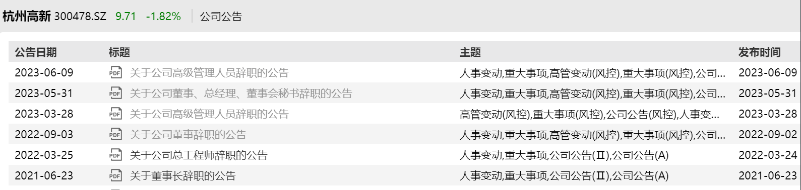 值得注意的是,在杭州高新连收罚单的同时,公司的管理层也在持续动荡,不少高管辞职。2022年3月,杭州高新总工程师吴畏因个人原因辞去职务;2022年9月3月,傅彬因个人原因申请辞去公司董事、董事会战略委员会委员等职务;2023年3月28日,副总经理胡炳林提出辞职;5月31日,董事会秘书蒋鹏提出辞职;6月9日,另一名副总经理凌勇同样以个人原因辞去副总职务。