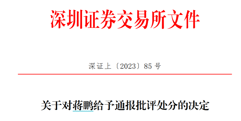 对此,2023年2月,深交所对蒋鹏给予通报批评的处分。深交所指出,蒋鹏作为公司董秘,明知公司存在关联方非经营资金占用,未督促及时对外披露,也未履行报告责任,未能恪尽职守、履行诚信勤勉义务。
