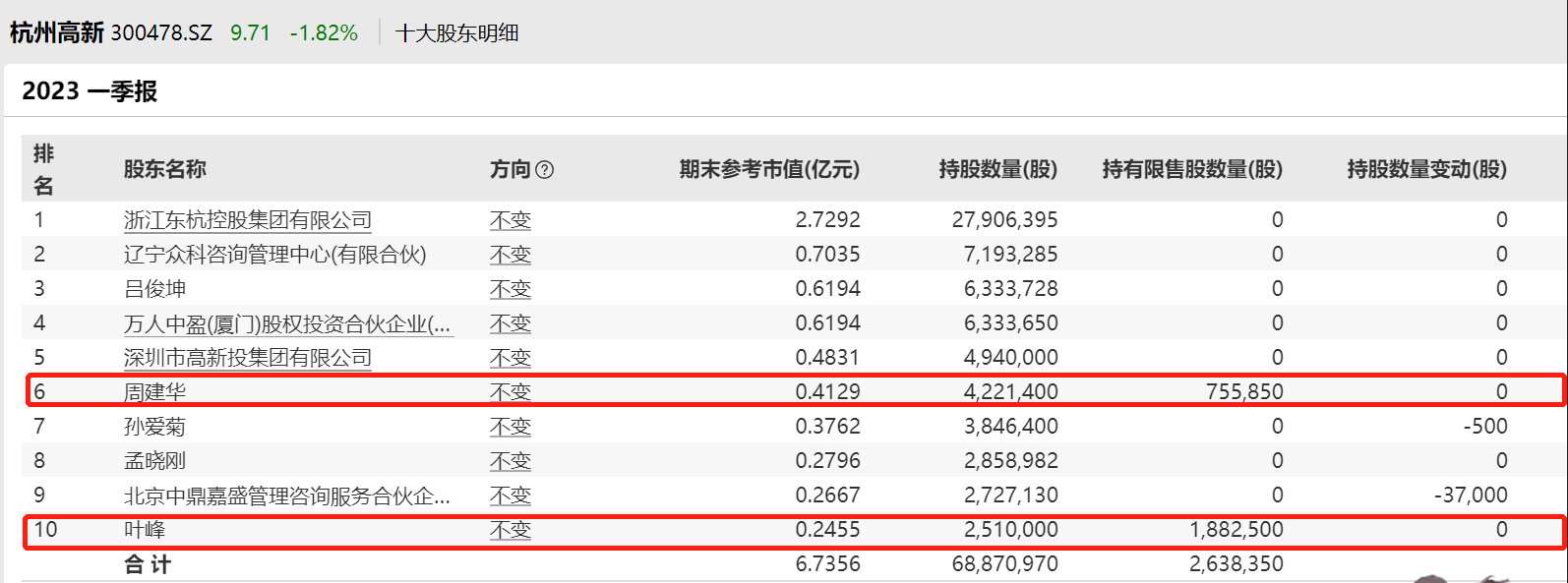 截至2023年一季度,在公司披露的十大股东明细中,周建华持股3.33%,为第六大股东;叶峰持股1.98%,为第十大股东。