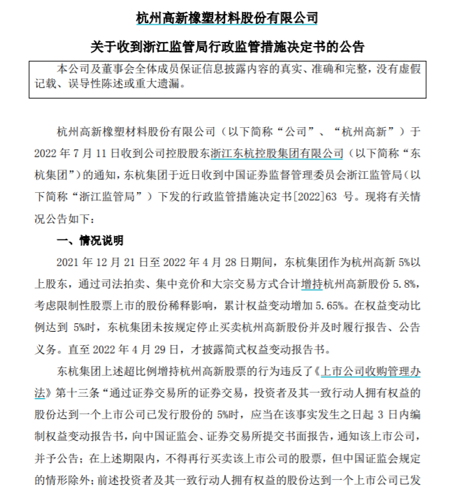早在2022年7月11日,杭州高新控股股东东杭集团就曾因超比例增持上市公司股票、未及时履行报告义务等违规行为,被浙江证监局采取出具警示函的行政监管措施。