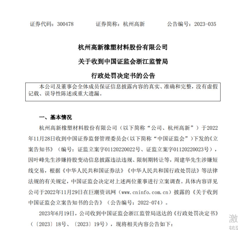 早在2022年11月,杭州高新发布公告称,其董事叶峰、周建华被证监会立案调查。随后在2023年6月19日,杭州高新收到了来自中国证监会浙江监管局的行政处罚决定书,对两名董事叶峰、周建华合计罚没190万元。