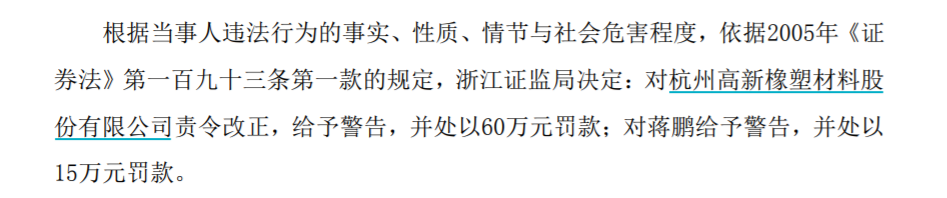2022年12月6日,杭州高新发布公告称,公司因信息披露违法违规行为,时任杭州高新董事会秘书蒋鹏收到中国证监会浙江监管局行政处罚决定书。公司罚款及董秘个人罚款合计75万元。
