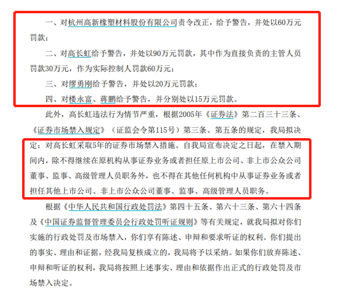 2022年10月10日,杭州高新还曾因未按时披露关联方非经营性资金占用、违规担保、共同借款等多项信披问题,被浙江证监局处以60万元的罚款;实控人高长虹处以90万元罚款;杭州高新时任财务总监缪勇刚处以20万元罚款;杭州高新时任董事、总经理楼永富及杭州高新时任董事会秘书蒋鹏分别处以15万元罚款。同时,作为公司的实控人,高长虹因违法行为情节严重,浙江证监局拟决定对高长虹采取5年的证券市场禁入措施。