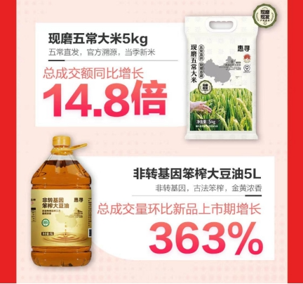 “吃”出烟火气,也要吃出健康。面对国人从“吃饱吃好”到“吃得健康”的转变,惠寻通过对产品品质的严格把控,让消费者享受更加健康的美好生活。原料源自欧洲产区的0反式脂肪葵花籽油等非转基因食用油系列产品,在今年618期间,总成交量环比新品上市期增长363%。