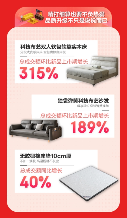 惠寻科技布艺双人软靠实木床,采用三防科技布面料,两段式床头设计,集舒适减压与稳定支撑于一体,618期间总成交额环比新品上市期增长315%。 针对人体工学设计,六大标准升级睡眠体验,0胶水天然安全的惠寻无胶椰棕床垫,总成交额同比增长40%。