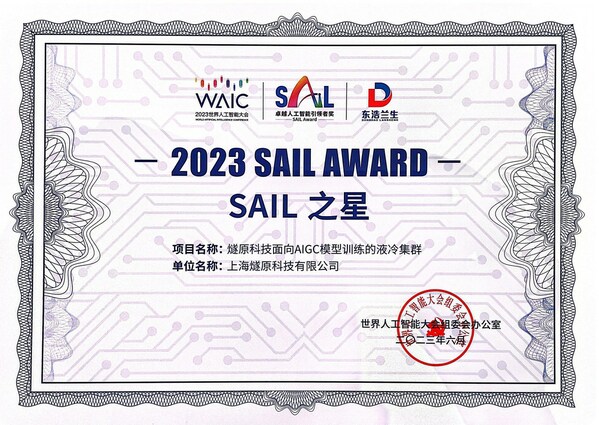 2023年7月6日下午,在2023世界人工智能大会产业发展论坛上,"燧原科技面向AIGC模型训练的液冷集群"从近千个参选项目中脱颖而出,荣膺世界人工智能大会"SAIL之星"。