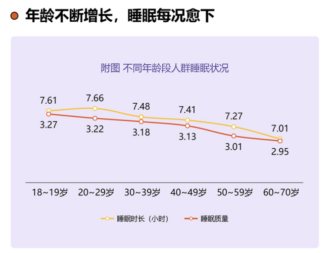 而在居住环境中,最值得重视的则是老年人睡眠健康问题。喜临门联合中国社会科学院发布的《中国睡眠研究报告2023》指出,2022年国人睡得更晚、起得更晚,入睡时间集中在23点至1点,比2021年国人的集中入睡时间向后推迟了1个小时。同时,随着人们年龄不断增长,其睡眠时长与质量均会每况愈下,其中,60岁至70岁的老人睡眠状况最差。因此,在老年人的养老服务中,睡眠升级或成为居住环境“适老化”改造的第一步。