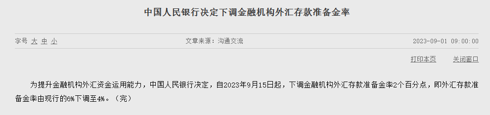 人民银行网站9月1日消息,为提升金融机构外汇资金运用能力,中国人民银行决定,自9月15日起,下调金融机构外汇存款准备金率2个百分点,即外汇存款准备金率由现行的6%下调至4%。