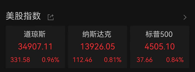 美国三大股指全线收涨,截至收盘,道指涨0.96%报34907.11点,标普500指数涨0.84%报4505.1点,纳指涨0.81%报13926.05点。