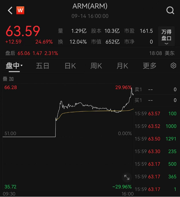 当地时间9月14日,英国芯片设计公司Arm Holdings正式登陆纳斯达克。上市首日,Arm开盘上涨10%,报56.10美元,盘中涨幅一度达到约30%。截至收盘,Arm股价上涨24.69%,报63.59美元,以收盘价计算,市值为652.48亿美元,若包括限制性股票单位在内,Arm完全摊薄后的估值接近680亿美元。