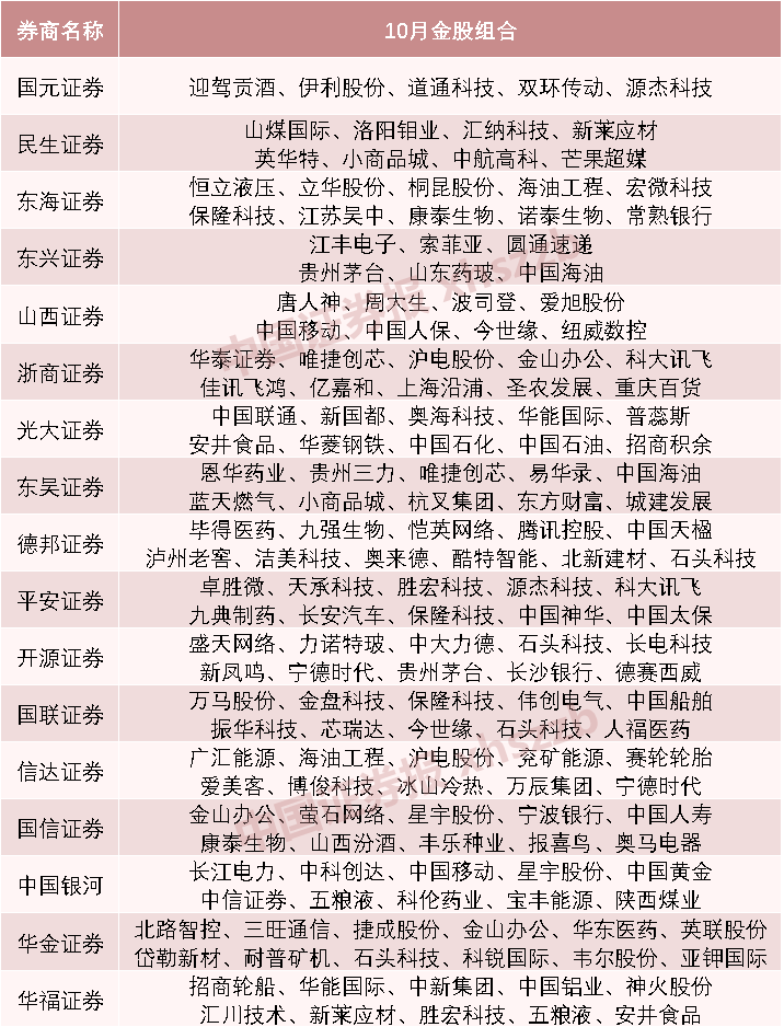 据中国证券报记者不完全统计,截至发稿,已有至少17家券商发布最新月度投资组合,10月共有135只A股及港股金股获得券商看好。