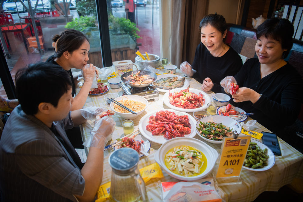 10月3日,黄女士(右一)与好友在潜江品尝小龙虾。 新华社记者伍志尊 摄