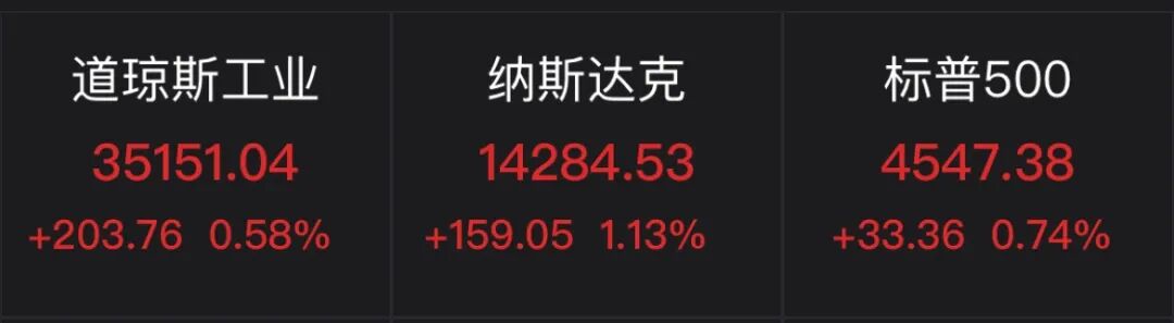 美国三大股指全线收涨,道指涨0.58%报35151.04点,标普500指数涨0.74%报4547.38点,纳指涨1.13%报14284.53点。
