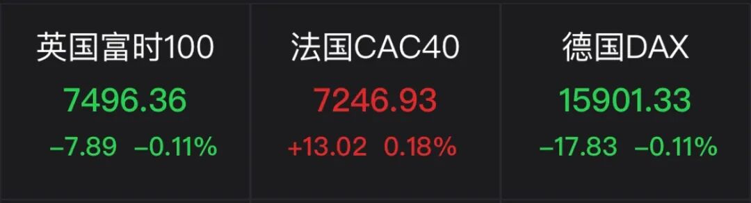 欧洲三大股指涨跌不一,德国DAX指数跌0.11%报15901.33点,法国CAC40指数涨0.18%报7246.93点,英国富时100指数跌0.11%报7496.36点。