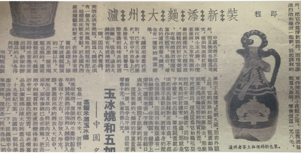 文章中报道了泸州老窖大曲酒最新上市的产品,称:“中国名酒不但品质好,而且装潢也极为考究……最近,著名的泸州老窖大曲酒,也有一种新的装潢销港。”