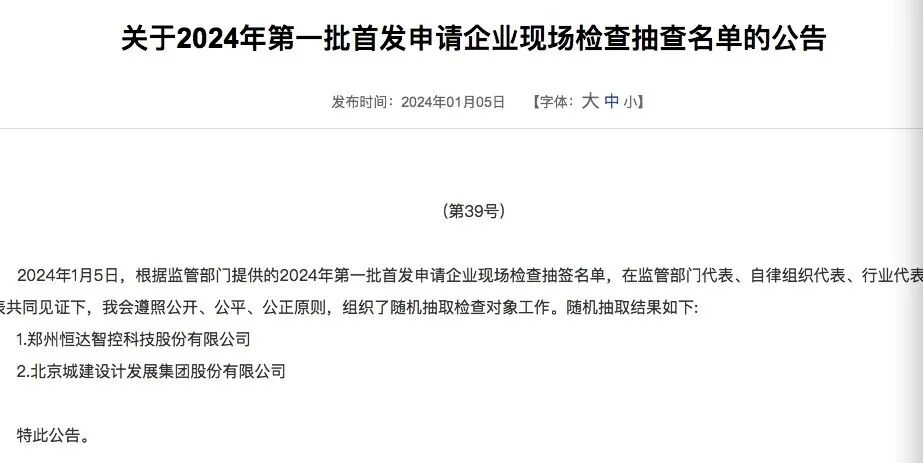 1月5日,中国证券业协会公布2024年第一批首发申请企业现场检查抽查名单。此次共有2家企业被抽查,分别为郑州恒达智控科技股份有限公司(简称“恒达智控”)和北京城建设计发展集团股份有限公司(简称“城建设计”),各由中信建投和中信证券保荐。