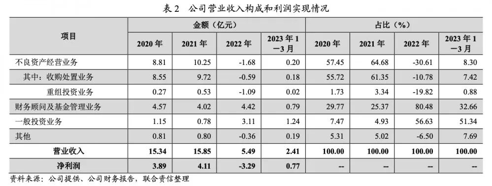 联合资信评级报告显示,2023年1-3月,安徽国厚实现营业收入2.41亿元,同比下降23.22%,其中不良资产经营业务收入仍然较少,占比仅8.3%;一般投资业务对收入贡献度仍然较高,占比51.34%。