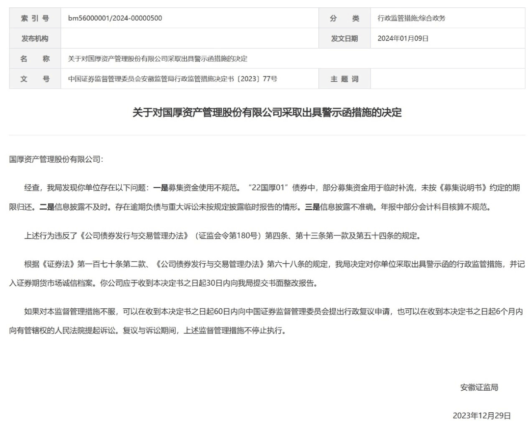 1月9日,据中国证监会安徽监管局网站显示,安徽国厚被安徽证监局出具警示函。