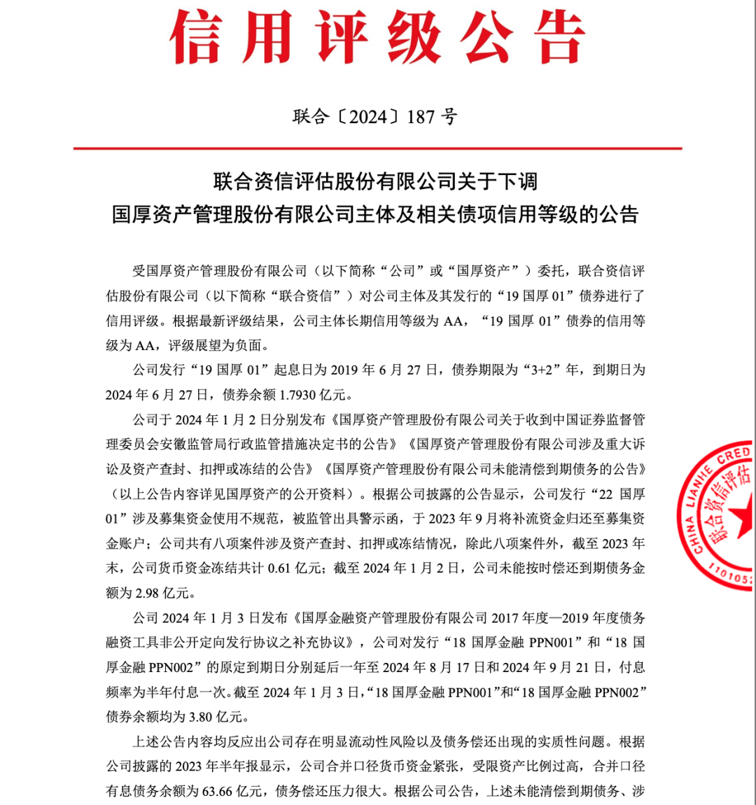 1月8日,联合资信公告,决定将安徽国厚主体长期信用等级由AA下调至A+,将“19国厚01”的信用等级由AA下调至A+,评级展望为负面。