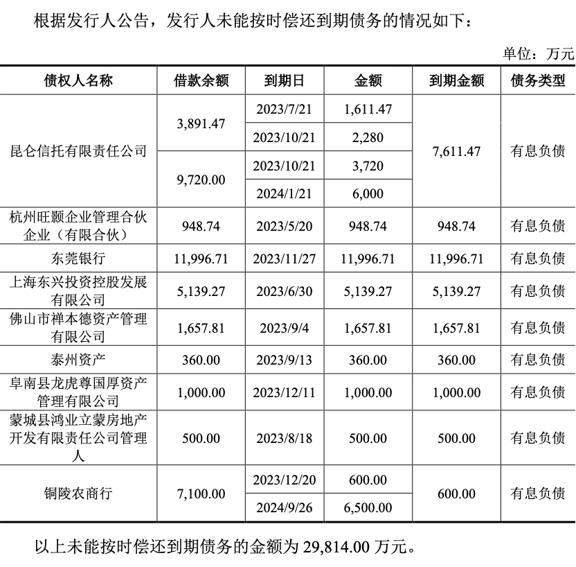 1月9日,安徽国厚发布西部证券关于安徽国厚未能清偿到期债务事项临时受托管理报告。报告显示,安徽国厚未能按时偿还到期债务金额为2.98亿元,安徽国厚正在与债权人沟通协商后续展期及还款方案,截至公告出具之日,尚未完成协议签署。