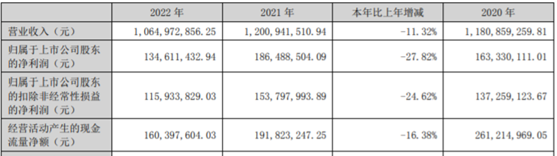 2020年至2022年,东港股份业绩起伏不定。其中,2022年归母净利润1.35亿元,同比下降27.82%。