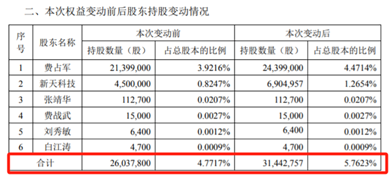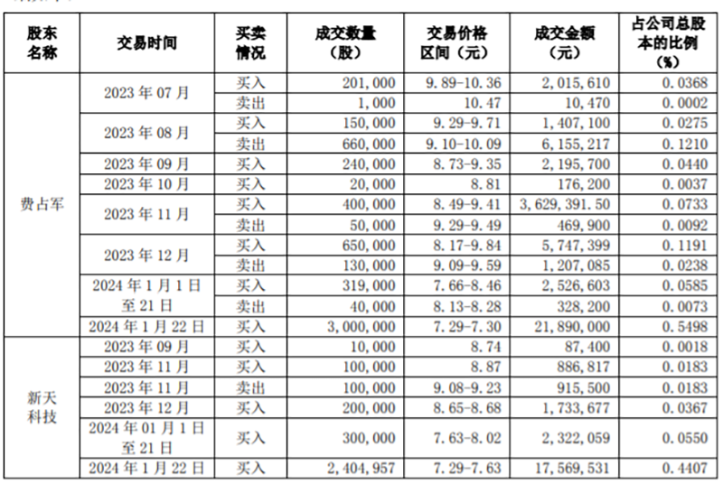 1月22日,费占军、新天科技以自有资金增持东港股份,导致费占军、新天科技及其一致行动人所持东港股份的股份比例,由4.77%变动至5.76%。