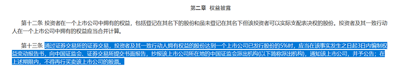 《上市公司收购管理办法》第十三条规定,通过证券交易所的证券交易,投资者及其一致行动人拥有权益的股份比例,达到一家上市公司已发行股份比例的5%时,应当在该事实发生之日起3日内编制权益变动报告书,向中国证监会、证券交易所提交书面报告,抄报该上市公司所在地的中国证监会派出机构,通知该上市公司,并予公告;在上述期限内,不得再行买卖该上市公司的股票。