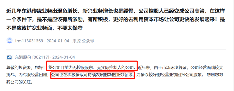 2024年1月4日,东港股份在互动平台称,公司目前无控股股东、无实际控制人。近年来,由于市场环境复杂,公司经营面临较大挑战,为克服经营困难积极争取可持续发展的新业务。