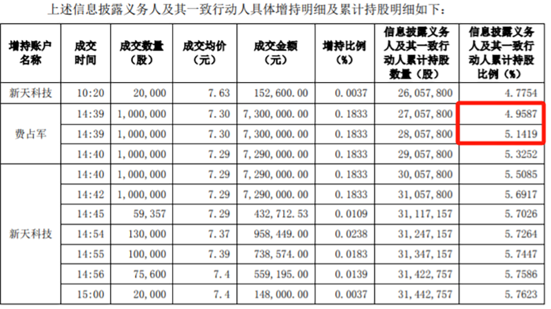 但从《简式权益变动报告书》披露的详细情况来看,1月22日,费占军、新天科技增持东港股份,在持股比例达到5%后,仍继续买入东港股份的股份。